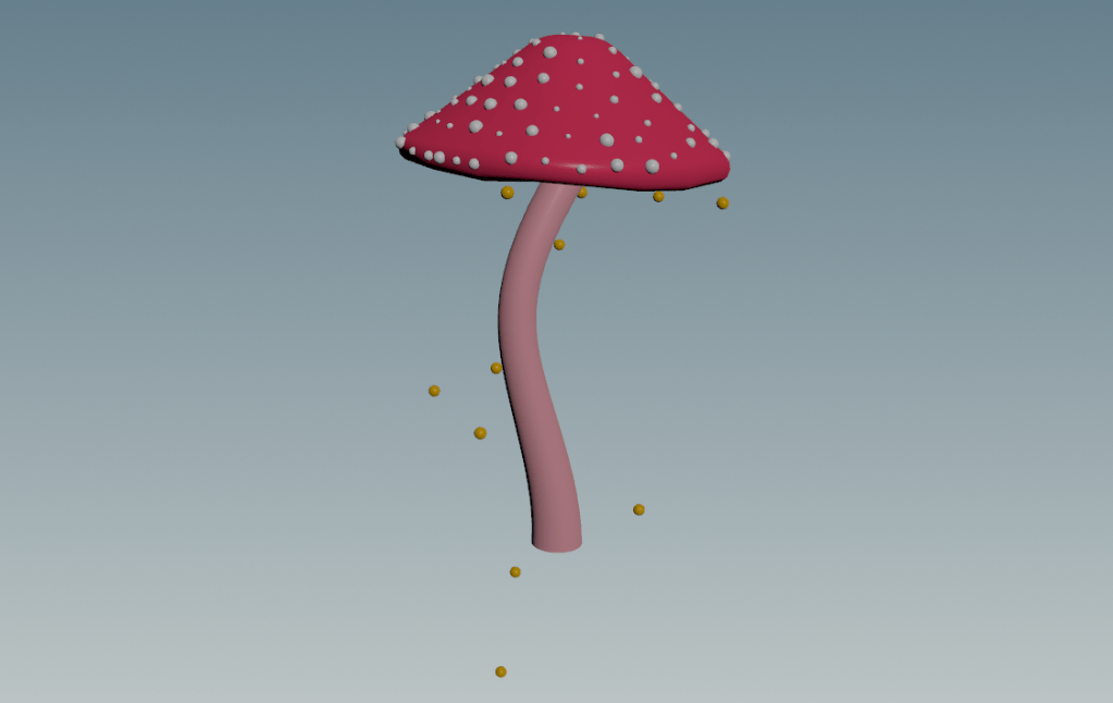 This is a mini project made from scratch by me. I created the mushroom shape using various nodes such as tube, mountain, polybevel and polyextrude. After that, I generated white spots of random sizes and scattered them on the mushroom cap. Finally, I generated yellow spores (similarly as the white spots) and ran them through a popnet.