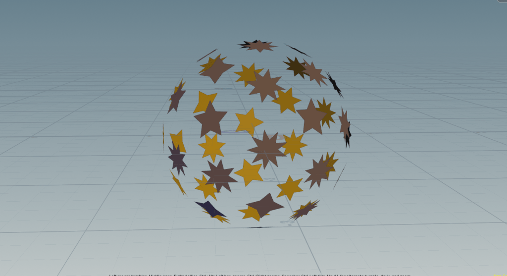 The purpose of this exercise is to create a ball made out procedural stars. Each star has a randomized number of corners. Additionally to the tutorial, I also made it spin and rescale over the time.